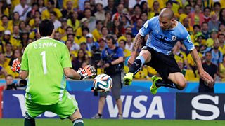 Live World Cup football commentary on Colombia v Uruguay in Rio de Janeiro.