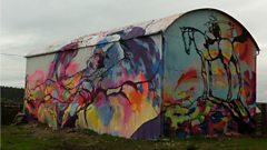 "Turn right at the psychedelic hay barn". The new landmark is easy to spot and has brought a smile and a surprise to many passing through Newton Stewart. The British landscape has inspired thousands of artists and Helen Mark travels through Dumfries and Galloway to see how teams of street artists have been working on 'rural murals' adorning old hay barns, slurry tankers and horse coats offered up by locals as a new canvas. While they may divide opinion, those on the Mull of Galloway say it's helped connect them with the rest of the region. She also stops off at the carved 'rosnes benches' - designed to make you stop, lie down and take a very different perspective on your surroundings.