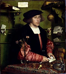 'If I had to choose one image to sum up the Hansa in its heyday,' says Neil MacGregor, 'It would be Holbein's 1532 portrait of Georg Gisze, a Danzig merchant trading in London.' The painting shows an expensively-dressed 33 year old man, his wealth and status indicated by a vase made of the finest, the thinnest Venetian glass, a small circular brass clock, certainly made in Southern Germany, and a Turkey carpet imported from the Levant.