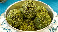 When the mixture had hardened, scoop out small spoonfuls and roll into bite sized balls. This can be a bit messy, but it is worth it. Finally roll the truffles in your chopped pistachio (use a mini chopper for the nuts if you have one), set them on a sheet of parchment and then pop them back in the fridge until you need them They will keep for several days there in an airtight container.