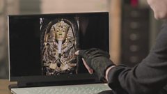 On 16 February 1923, Carter and Carnarvon broke through into Tutankhamun’s burial chamber. A large blue and gilt shrine filled the room. Opening its doors, Carter discovered sealed doors to another three shrines, one within the next. Within these was a sarcophagus made from yellow quartzite and, within this, a nest of three coffins, also one within the next. For the first time in a century, we reveal each stage in amazing coloured detail. The outermost coffin was gilt, adorned with a garland of flowers. The middle one was inlaid with gold and coloured glass and the innermost was - incredibly - crafted from solid gold.
