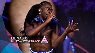 Lil Nas X performs Industry Baby (feat. Jack Harlow) at Glastonbury 2023.