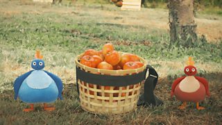 The Twirlywoos watch a man pick fruit until his basket is full.