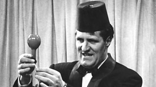 Tommy Cooper prepares the audience for his ‘eggs’ trick.