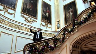 Will Gompertz climbs the Grand Staircase at Buckingham Palace.
