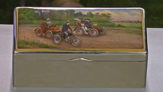Beautifully executed enamelling and a rare early motoring scene