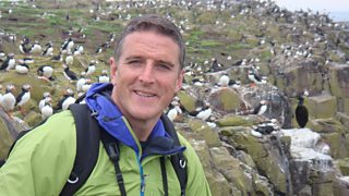 Bydd Iolo yn gweld miloedd o adar y m么r a gwiwerod coch yn goroesi yn eu cynefin naturi...