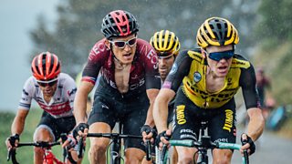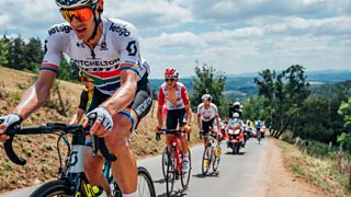 Diwrnod o ddringo di-baid sy'n wynebu'r peloton ar y 8fed cymal i Saint-脡tienne. Stage ...