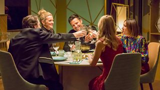 Jonathan Ross has to go around the table and guess which of his fellow dinner guests have been handcuffed.