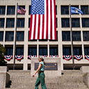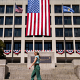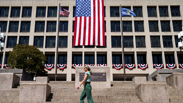 A member of the public passes the US Department of Labour in Washington DC, USA, 05 September 2025.