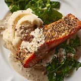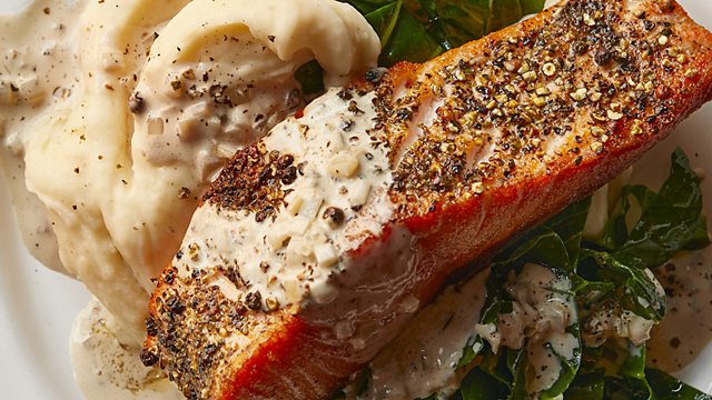 Crispy peppered salmon with a creamy sauce.