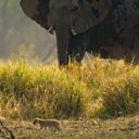 Two young lion cubs hide from angry elephants
