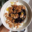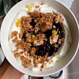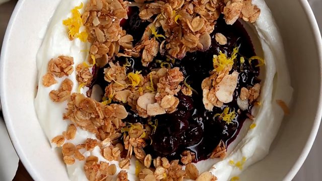 Topped with a pan-fried granola and chia blueberry jam.