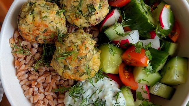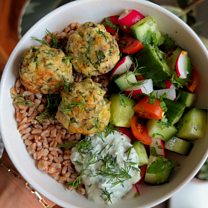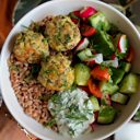 Greek-style turkey meatball grain bowl