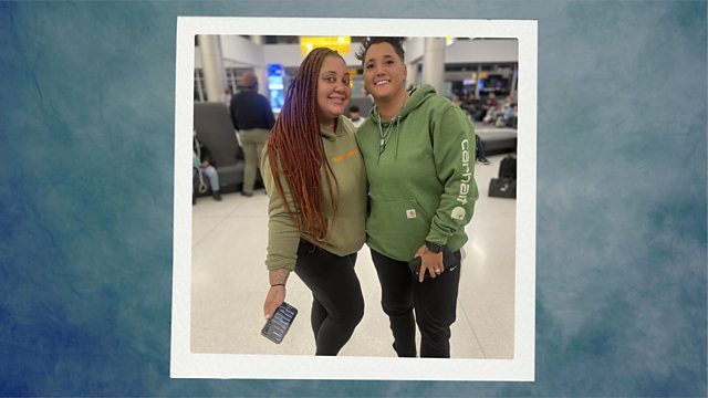 (Photo: Cassandra Madison (L) and Julia Tinetti (R) at an airport. Cassandra has long brown hair in braids, Julia's hair is short and a darker shade of brown. Credit: Julia Tinetti)