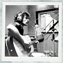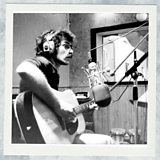 (Photo: A black and white photo of a young Rogér Fakhr from the 1970s, in a recording studio in Lebanon sitting in front of a microphone, wearing headphones and holding a guitar. Credit: Raymond Sabbah)
